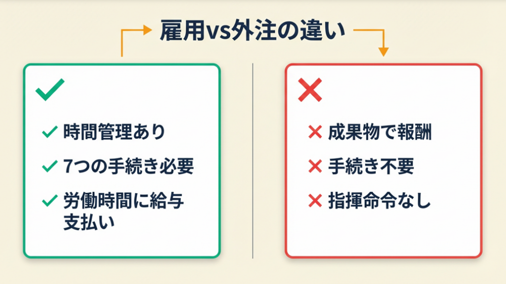 外注(業務委託)は成果物に対して報酬を支払いますが、雇用は労働時間に対して給与を支払います。雇用の場合のみ以下で説明する7つの手続きが必要になり、外注であれば手続き義務は発生しません。この違いを理解せずに「実態は雇用なのに業務委託契約を結ぶ」と、労働局の調査で偽装請負と認定されるリスクがあります。