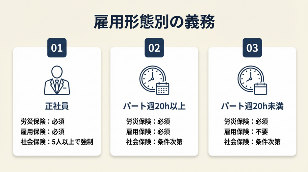 A: 常時5人以上が強制適用の基準です。1〜4人のパートのみであれば社会保険は任意加入ですが、労災保険・雇用保険(週20h以上)は1人でも必要です。