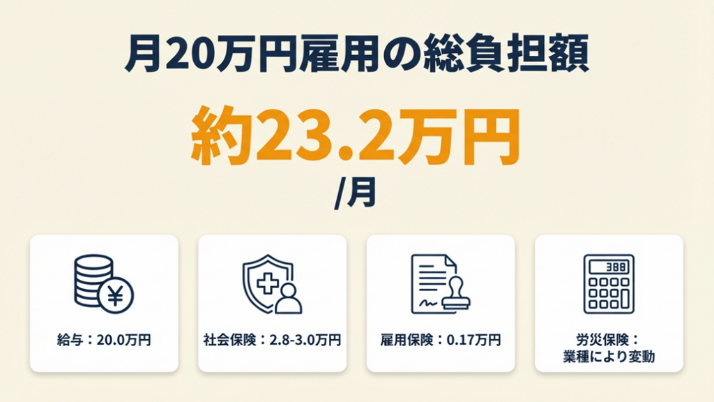 給与月20万円の従業員を雇うと、事業主の実質負担は給与以外に社会保険料・雇用保険料が上乗せされます。