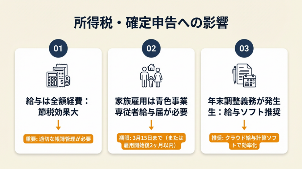 従業員を雇うと、確定申告の内容が変わります。節税に活かせる要素が増える一方、年末調整などの事務負担も生じます。プラスとマイナスの両面をあらかじめ把握しておくことが重要です。