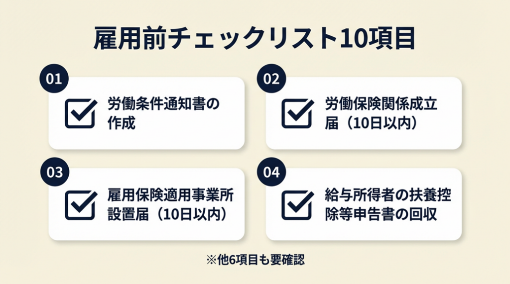 | 採用前に確認すべき項目を一括チェック | 雇用前チェックリストは10項目で確認 | 5分 |