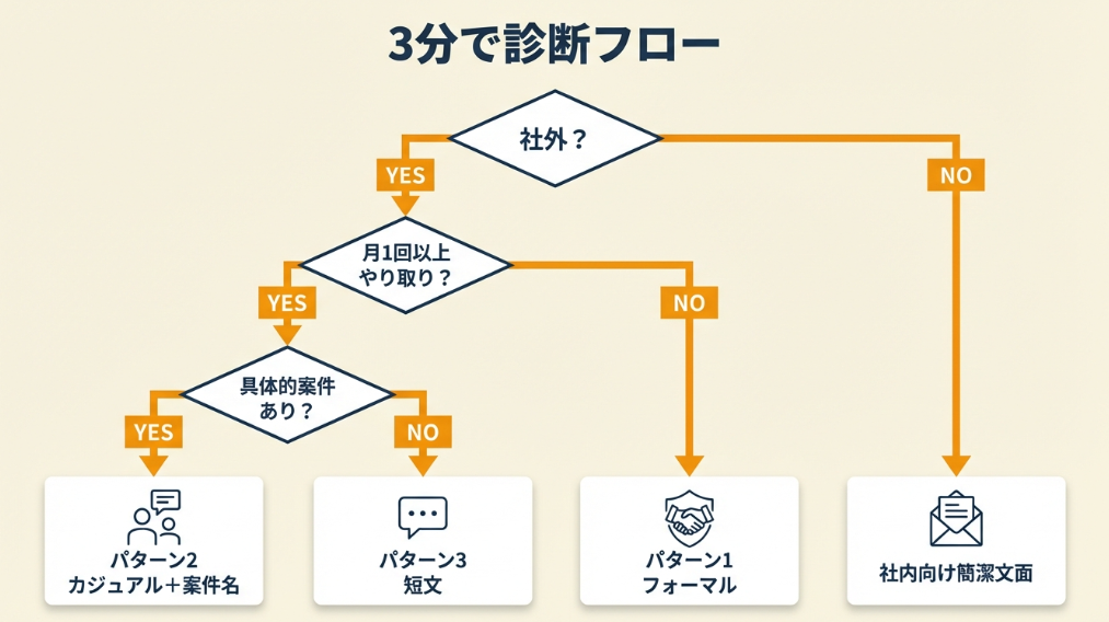 - いいえ → 【結果A】社内向けの簡潔な文面でOK