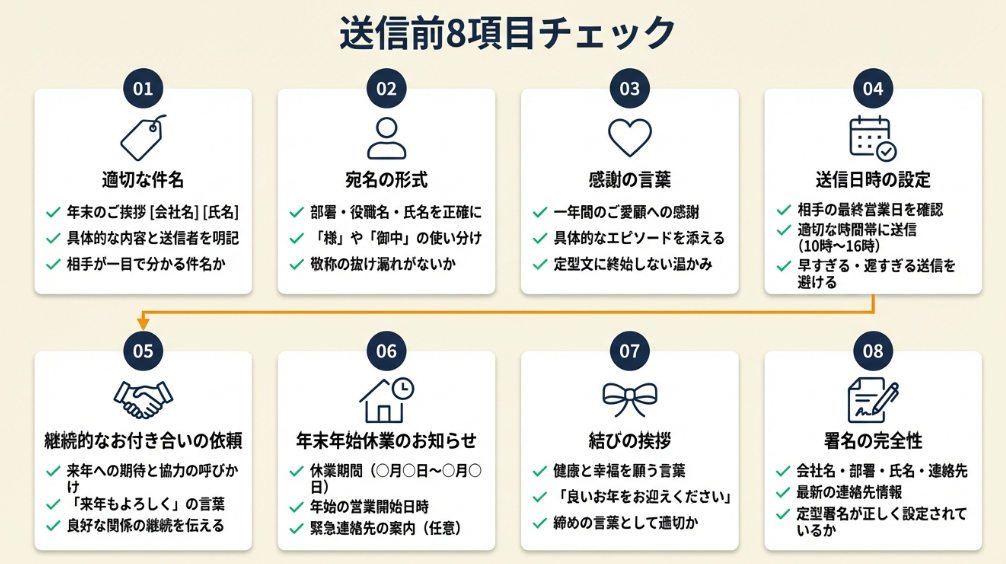 ビジネスの年末挨拶メールは、次の8パーツで構成するのが基本形です。件名、宛名(会社名・部署名・役職・氏名+様)、導入の挨拶(いつもお世話になっております+自社名・氏名)、1年のお礼、来年への一言、年末年始の営業日、結びの挨拶(良いお年をお迎えください)、署名(会社情報・連絡先)。