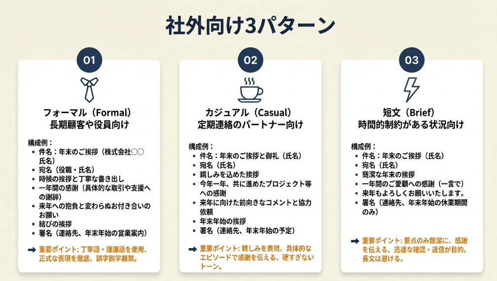 社外の取引先や顧客に送る年末挨拶メールは、相手との関係性に応じて文面を変えるのがポイントです。以下の3パターンからそのまま使える例文を用意しました。Gmailテンプレート機能に保存しておくと、来年以降も数秒で呼び出せます。