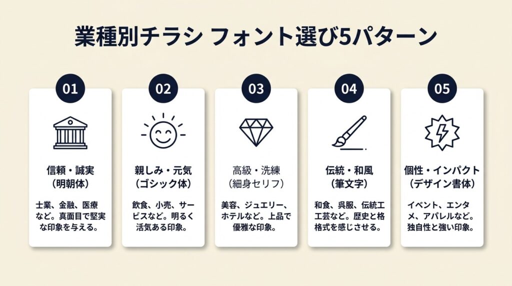 業種ごとに読み手が無意識に期待している「印象の文法」があります。それに外れたフォントを使うと、内容より先に「なんか違和感がある」と感じさせてしまいます。以下の5パターンを参照して、業種に合ったフォントを即座に選んでください。