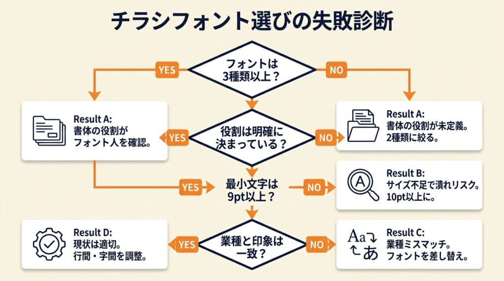 ▶ 今すぐやること: 手持ちのチラシを開き、使用フォントが「ゴシック系」「明朝系」「その他」の何系統かを数えてください。3系統以上あれば今日中に2系統以内に絞る(10分)