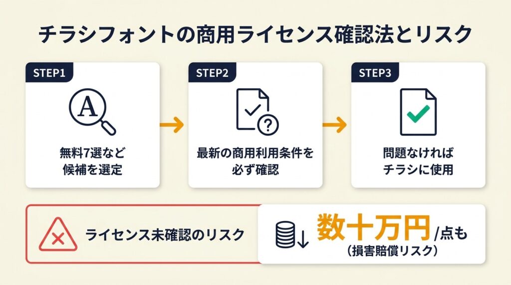フォントのライセンスを確認せずに商業チラシに使用すると、著作権問題が発生するリスクがあります。以下の7つはすべてチラシへの商用利用が可能とされているフォントです。利用前に各フォントの最新ライセンス条件を必ず確認してください。なお、著作権侵害の損害賠償リスクは画像1点でも数十万円になるケースがあるため、フォントのライセンス確認は事前に徹底してください。