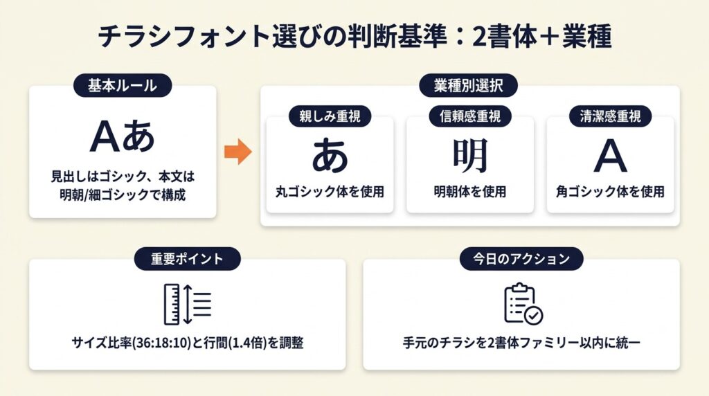 チラシのフォント選びは「1チラシ2書体ファミリー、業種に合った系統を選ぶ」というルール1つで8割の問題が解消します。ゴシック体を見出しに、明朝体または細ゴシックを本文に割り当て、業種が「親しみ重視」なら丸ゴシック、「信頼感重視」なら明朝体、「清潔感重視」なら角ゴシックのみに絞るだけです。フォントの種類よりも、サイズの比率(36:18:10)と行間(1.4倍)の調整のほうが、読みやすさへの影響が大きい点を覚えておいてください。