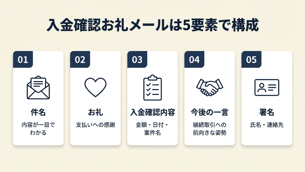 入金確認お礼メールの構成は、次の5要素で成り立っています。