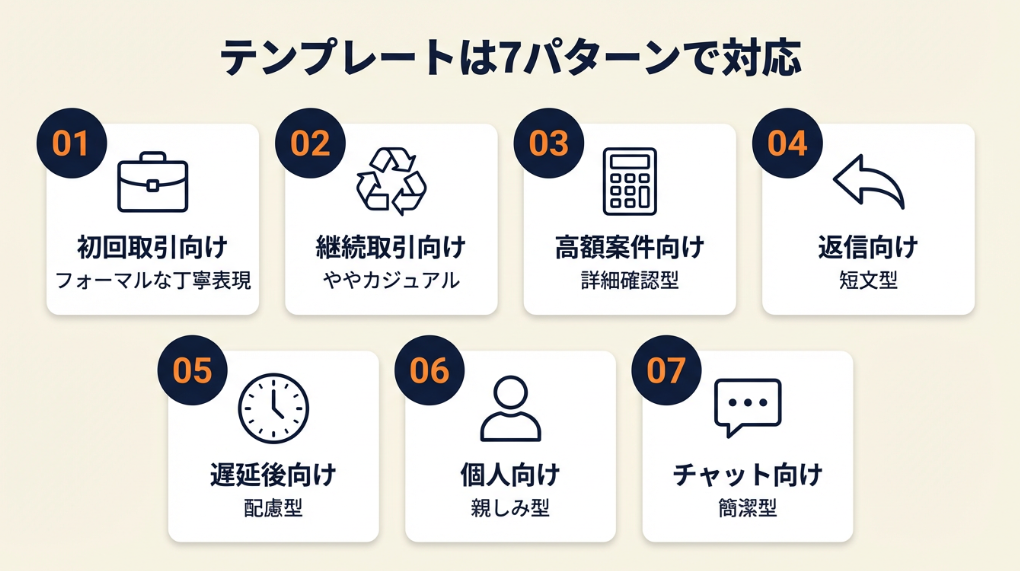 【コツ】 取引形態別に3パターン用意するところから始めてください(初回・継続・短文返信)。1パターンだと毎回の修正量が多くなり、手間が減りません。Gmailテンプレートの設定から活用術では、定型文の登録手順をステップごとに解説しています。