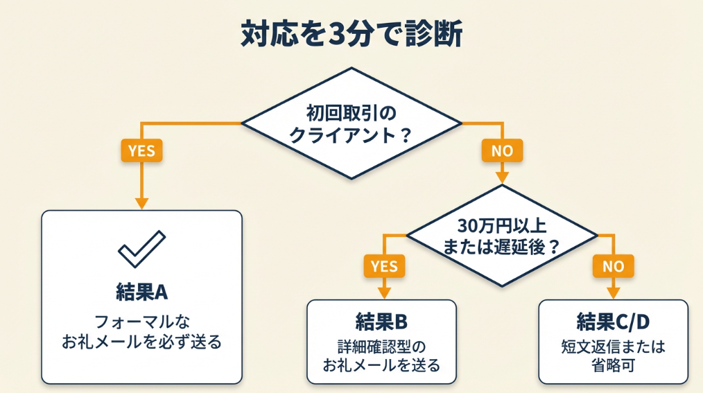 分岐点: お礼メールを送らず入金確認を放置していたら、クライアントは「ちゃんと届いたのか」と不安を感じ、追加発注の際に別の候補を検討していた可能性があります。