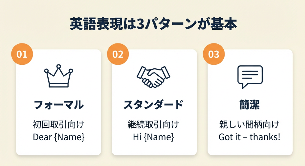 英語メールは3パターンの定型表現で対応でき、トラブル時は「確認→再確認→相談」の3段階で冷静に対処できます。案件名と一言コメントの2箇所を毎回変えるところから始めてください。