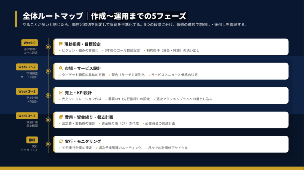 融資や補助金申請でなければ、ページ数は気にしなくて構いません。自分が行動するための「判断軸」として機能すれば十分です。本記事のワークブックを埋めるだけでも、実用的な計画になります。
