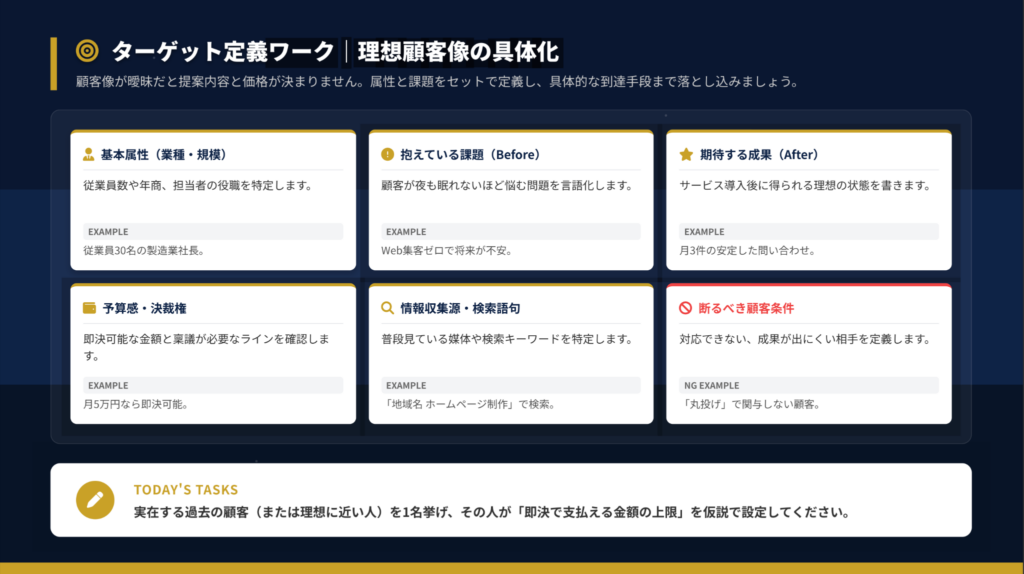 顧客像が曖昧だと提案内容と価格が決まりません。実在する過去の顧客(または理想に近い人)を1名挙げ、その人が「即決で支払える金額の上限」を仮説で設定してください。