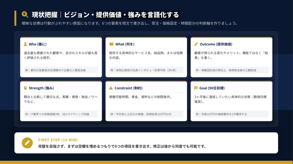 曖昧な目標は行動がぶれやすい原因になります。以下の6要素を言語化することで、受注・価格設定・時間配分の判断軸が明確になります。