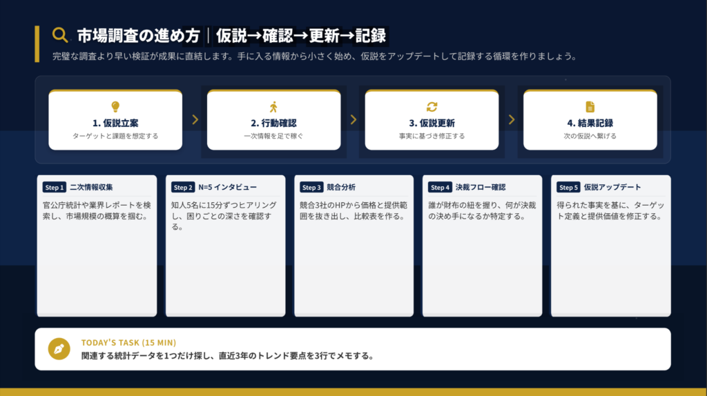 市場調査は「仮説立案→行動確認→仮説更新→結果記録」の循環で進めます。以下の5ステップを順に実行してください。