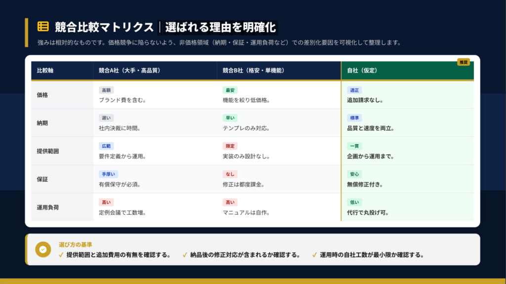 強みは相対的なものです。以下の比較軸で競合との差を整理しましょう。