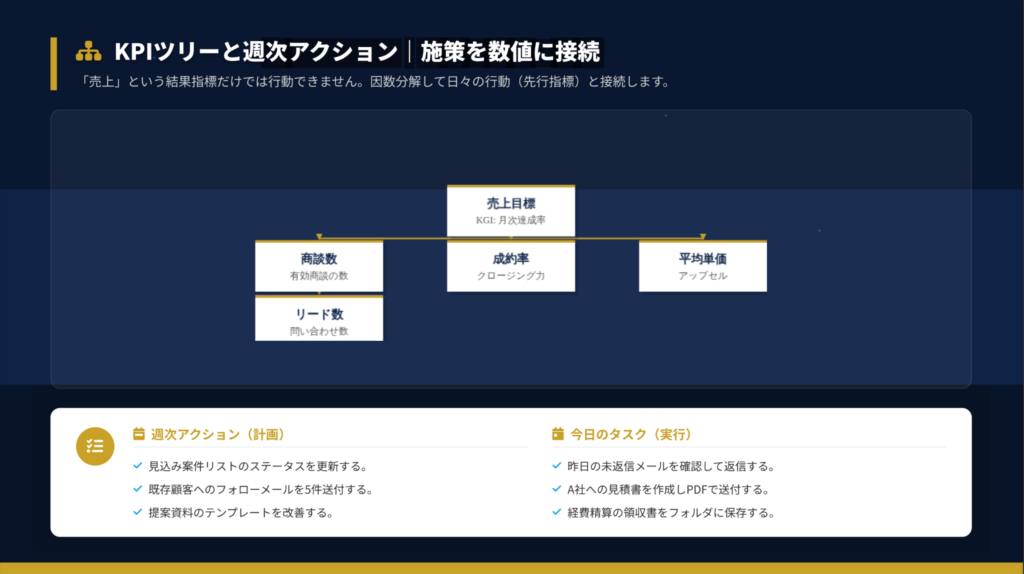 週次アクション(計画)として、見込み案件リストのステータス更新、既存顧客へのフォローメール5件送付、提案資料のテンプレート改善を設定します。今日のタスク(実行)として、昨日の未返信メール確認・返信、見積書作成・送付、経費精算の領収書保存を実行します。