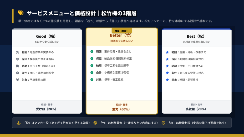 松竹梅の設計には明確な役割があります。「松」はアンカー役(高すぎて竹が安く見える効果)、「竹」は利益最大(一番売りたい内容にする)、「梅」は機能制限(安易な値下げ要求を回避)という位置づけです。