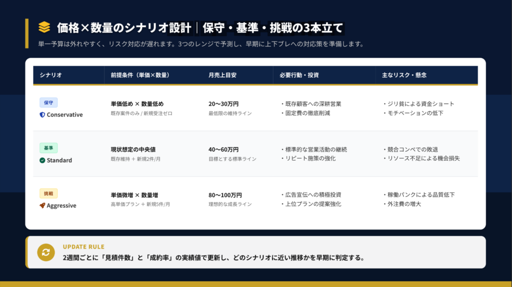| 保守 | 既存案件のみ/新規受注ゼロ | 20〜30万円 | 既存顧客への深耕営業、固定費の徹底削減 | まずは生存ラインを確保 |
