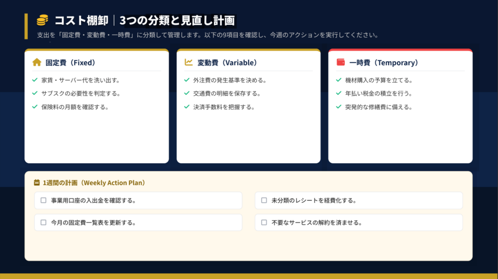 | Day 61-90 | 最適化・仕組化 | 単価改定のテスト、一部外注の試行、成功パターンの標準化 | 効率化と収益向上を図る |