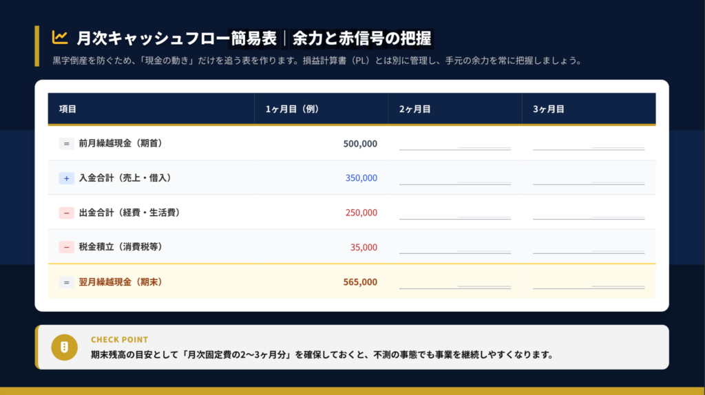 売上が急に止まっても、2〜3ヶ月は事業を継続できる余裕を持つためです。この期間で次の案件を獲得するか、方針転換を図れます。