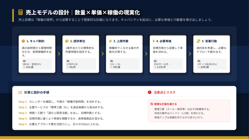 1. キャパ制約 週の総時間から管理時間を引き、実質稼働枠を出します。管理工数(メール・請求等)は必ず2割確保してください。例: 週40h − 管理20% = 32h/週