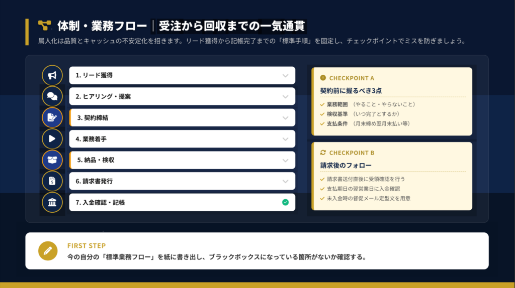 1. リード獲得 → 2. ヒアリング・提案 → 3. 契約締結 → 4. 業務着手 → 5. 納品・検収 → 6. 請求書発行 → 7. 入金確認・記帳