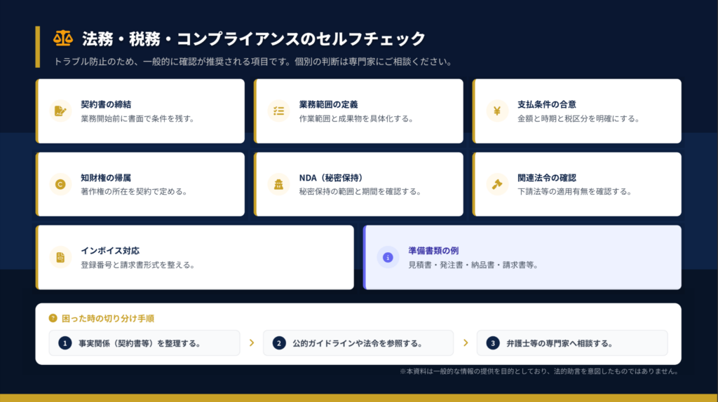 契約前に握るべき3点として、業務範囲(やること・やらないこと)、検収基準(いつ完了とするか)、支払条件(月末締め翌月末払い等)を必ず確認してください。