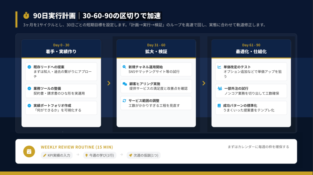 | Day 0-30 | 着手・実績作り | 既存リードへの提案、業務ツールの整備、実績ポートフォリオ作成 | まずは1件目の受注を目指す |