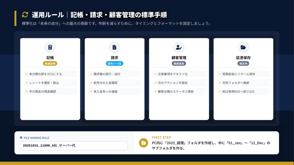 | 証憑保存 | 発生時 | 受領直後にリネーム保存、月別フォルダへ格納、紙は専用BOXへ放り込む | 書類が散乱している |