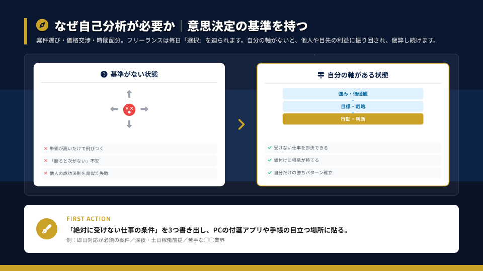 自己分析の本質は「迷いを減らし、選択の基準をつくる」ことです。フリーランスは毎日「選択」を迫られます。案件選び、価格交渉、時間配分、スキル習得。自分の軸がなければ、他人の成功法則を真似て失敗したり、目先の利益に振り回されたりします。