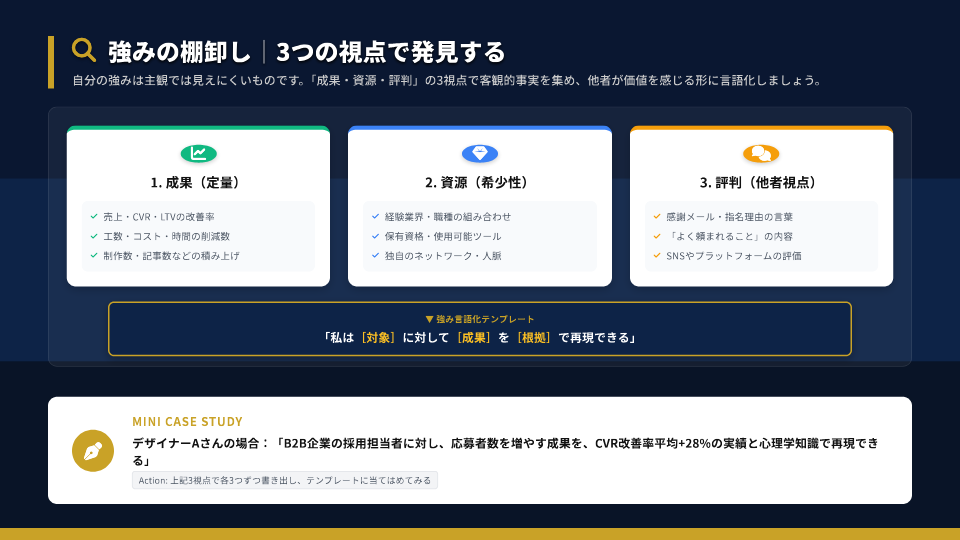 たとえばデザイナーの場合、「B2B企業の採用担当者に対し、応募者数を増やす成果を、CVR改善率平均+28%の実績と心理学知識で再現できる」という形で言語化できます。