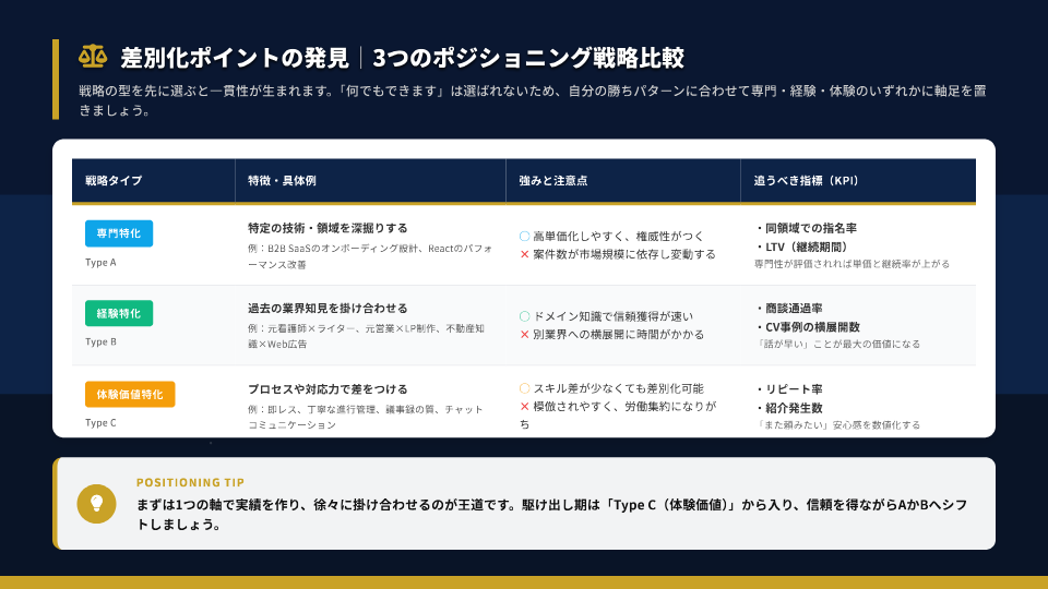 | 体験価値特化(Type C) | プロセスや対応力で差をつける。例:即レス、丁寧な進行管理、議事録の質 | リピート率、紹介発生数 | スキル差が少ない駆け出し期 |