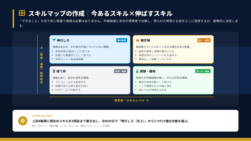 STEP 1: 4象限に現在のスキルを8項目まで書き出す 稼ぎ頭(高価値×得意)、伸びしろ(高価値×苦手)、実験・趣味(低価値×得意)、捨て枠(低価値×苦手)に分類します。
