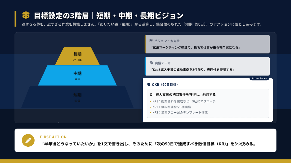 | 長期(ビジョン) | 2〜3年 | 「B2Bマーケティング領域で、指名で仕事が来る専門家になる」 | 方向性を定めたい人 |