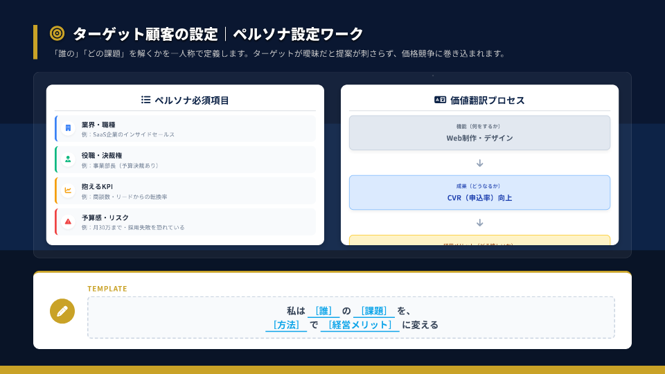 ペルソナ設定で押さえるべき項目は、業界・職種、役職・決裁権、抱えるKPI、予算感・リスクの4つです。ここが曖昧だと提案が刺さらず、価格競争に巻き込まれます。