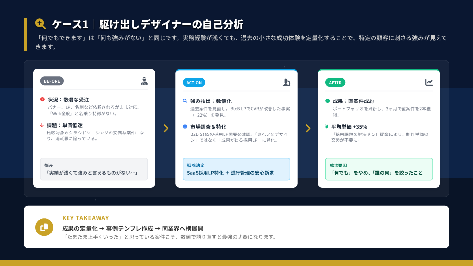 自己分析によって得られる変化は明確です。受けない仕事を即決できるようになり、値付けに根拠が持てるようになり、自分だけの勝ちパターンが確立します。