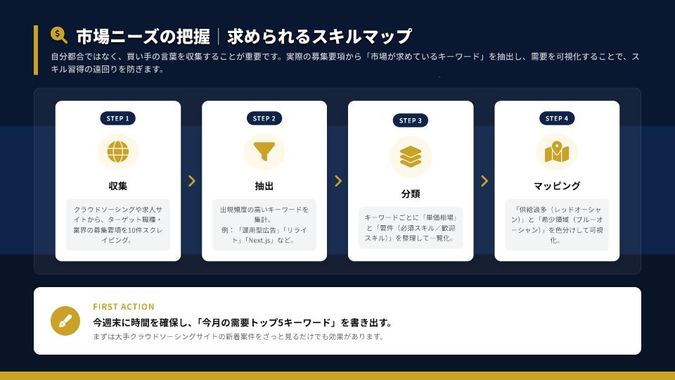 「自分が好きなこと」だけで仕事を選んでいませんか? 市場が求めているキーワードを収集することで、スキル習得の遠回りを防げます。