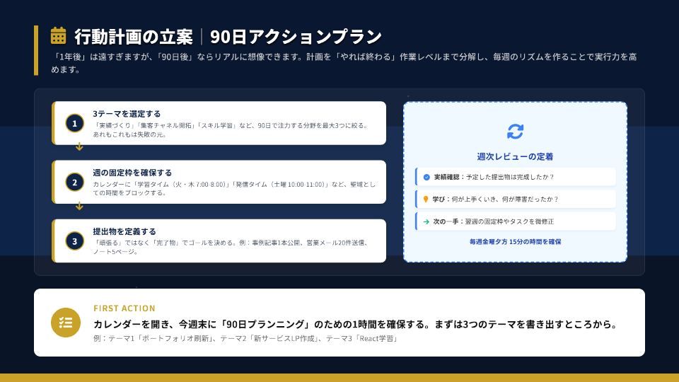 毎週金曜夕方15分を固定枠としてカレンダーに登録することです。実績確認、学び、次の一手の3項目だけに絞れば、負担なく継続できます。