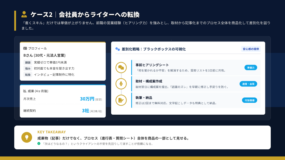 事前ヒアリングシートの共有、取材翌日の構成案提出、文字起こしデータの特典納品など、プロセス全体を商品化。結果、4ヶ月後には月次売上30万円(安定)、継続契約3社を獲得しました。