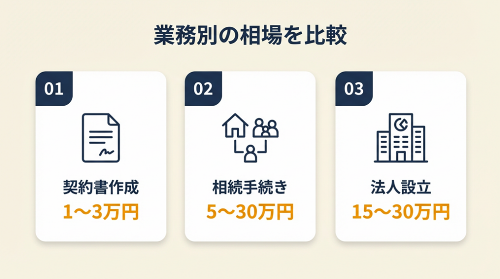 - 契約書1〜3万円・相続5〜30万円・法人設立15〜30万円の業務別相場がわかる