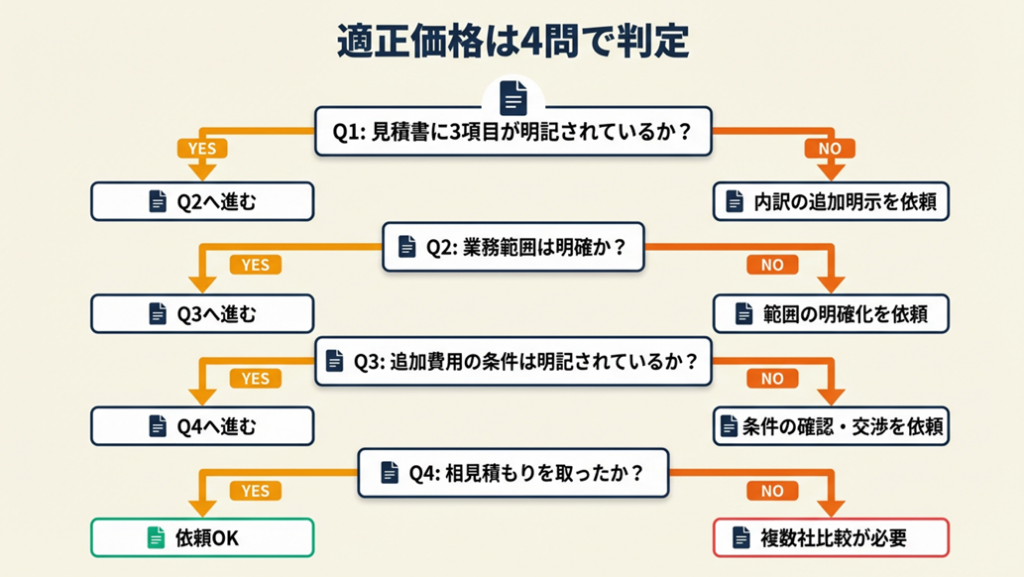 見積もりの妥当性に迷ったときは、以下の4問で判定できます。自分の状況に応じた行動が明確になります。