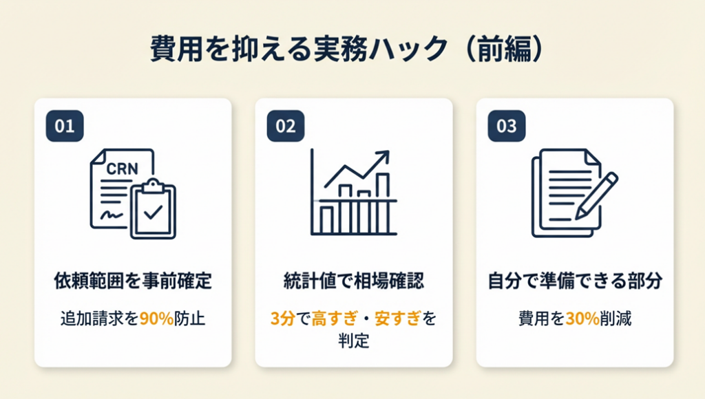 | コスパよく依頼する実践テクを知りたい | 行政書士費用を適正化する5つの実務ハック | 10分 |
