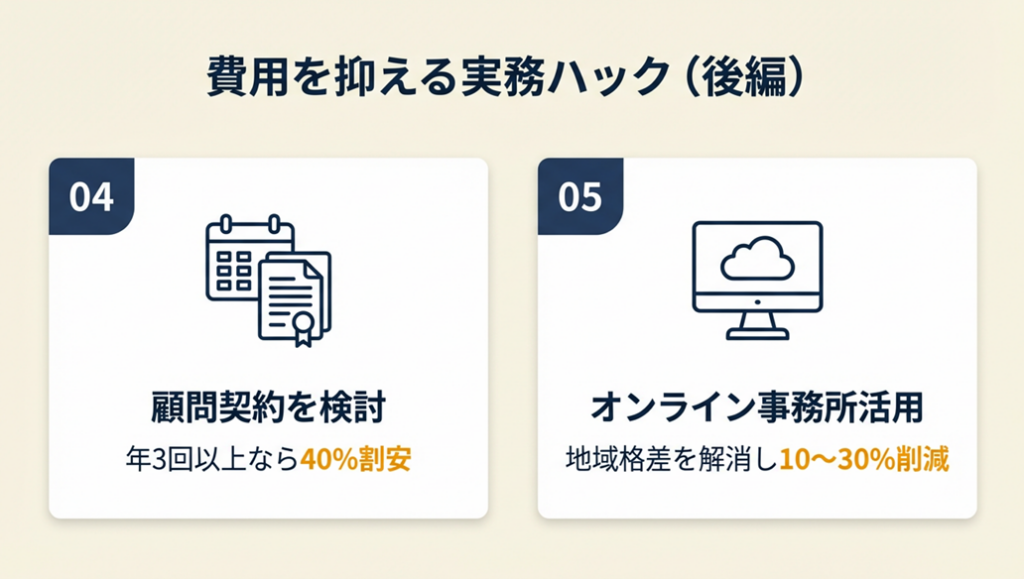 - 【ポイント】: 年3回以上の依頼予定がある場合、顧問契約で費用を抑えられます。相談のたびに都度調整する手間もなくなるため、トータルのコストパフォーマンスが上がります。