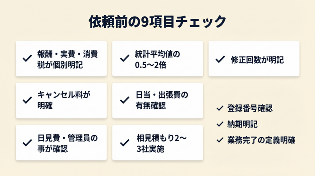 - No → 依頼前に必ず確認してください。特にキャンセル料と修正対応の回数制限は見落としがちです