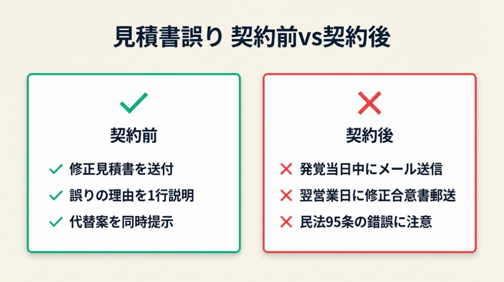 契約後に見積誤りが判明した場合、民法上の問題(錯誤による意思表示:民法95条)が関わる可能性があるため、速やかな書面対応が必要です。なお、現行民法95条(2020年改正後)では、錯誤による意思表示は「無効」ではなく「取り消すことができる」と規定されています。「発覚当日中のメール送信+翌営業日の修正合意書の郵送」が推奨されます。