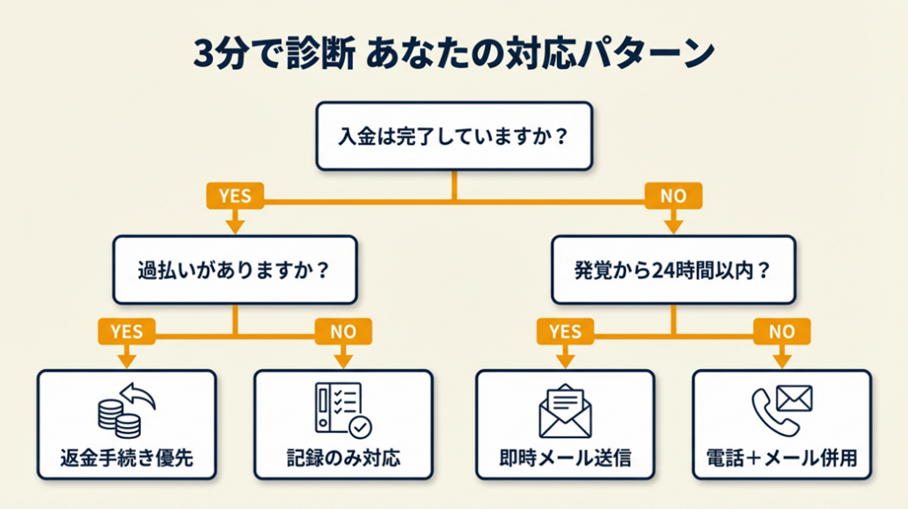 | 入金後に誤請求が発覚した | 入金済み誤請求は返金手続きが最優先 | 3分 |