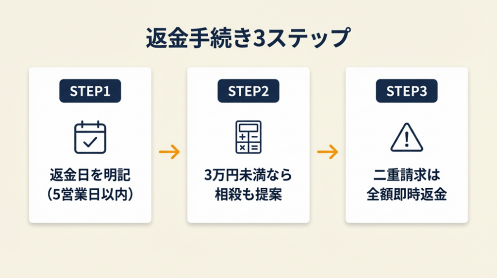 返金日は「メール送信から5営業日以内」を目安に設定することで、相手の不安を最小化できます。5営業日を超える場合は中間報告メールを1通挟む設計にしてください。