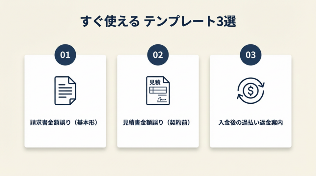 本記事のテンプレートをそのままコピーして送信し、翌営業日に正しい請求書を再送してください。